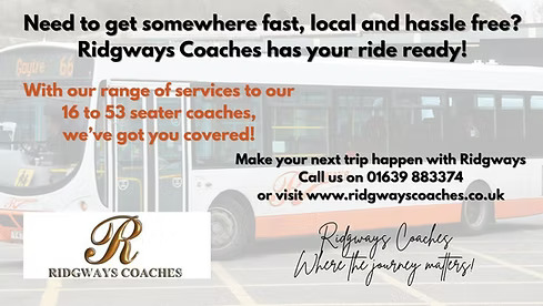 Established in 1997, Ridgways Coaches Limited is a premier coach hire company based in Port Talbot. We can offer a friendly, professional coach travel at affordable prices. Contact us today to discuss your specific requirements. Visit ridgwayscoaches.co.uk or call us today on 01639 883374.